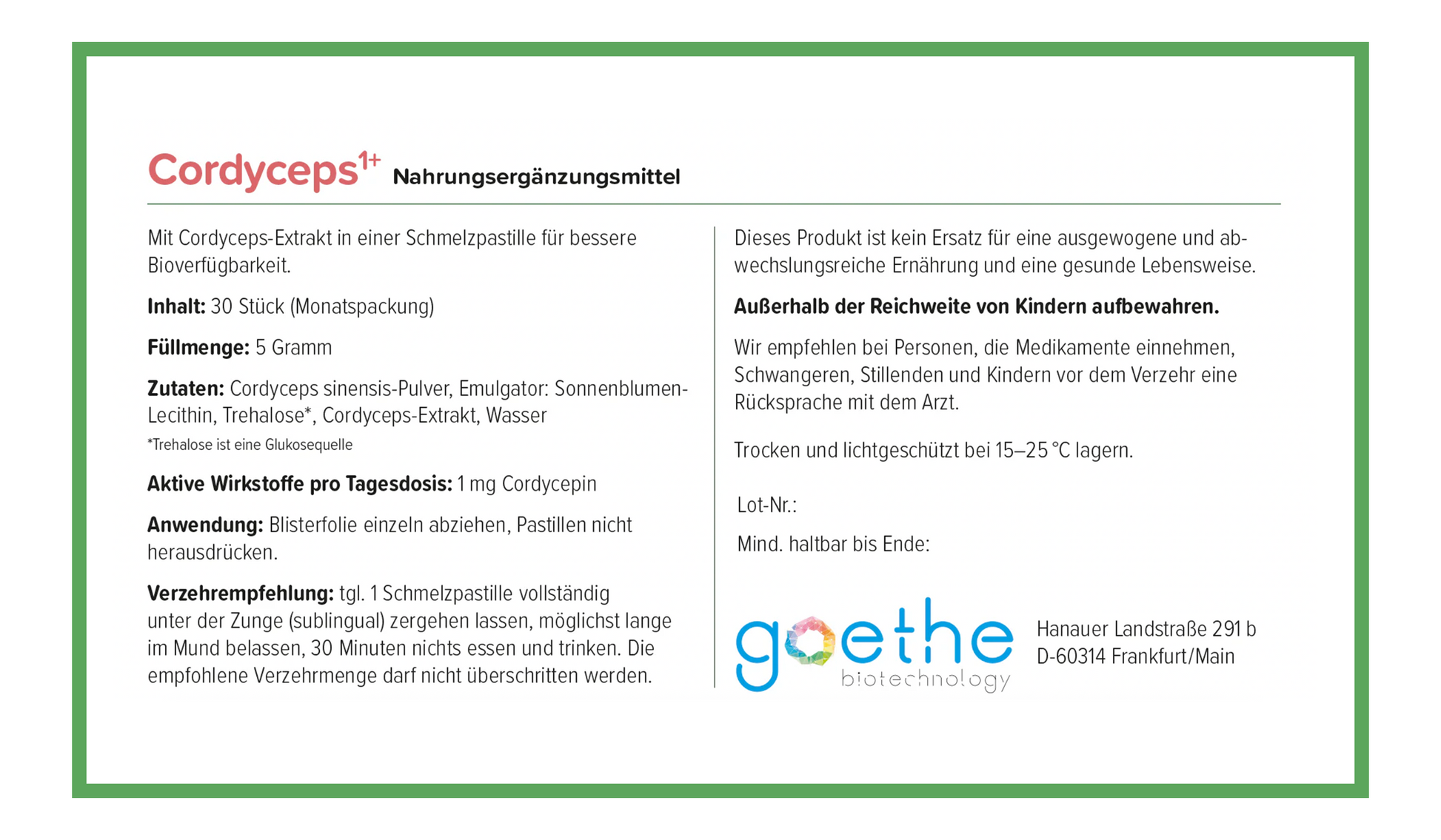 Jede Schmelzpastille enthält Cordyceps-Pulver mit allen Wirkkräften des Pilzes und mindestens 1mg reines Cordycepin.